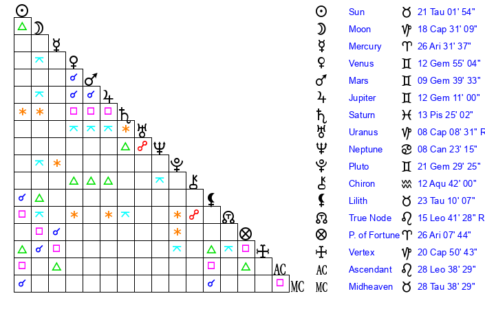 | Moon | 18 Capricorn 30 | 22 Scorpio 14 | 21 Taurus 37 |