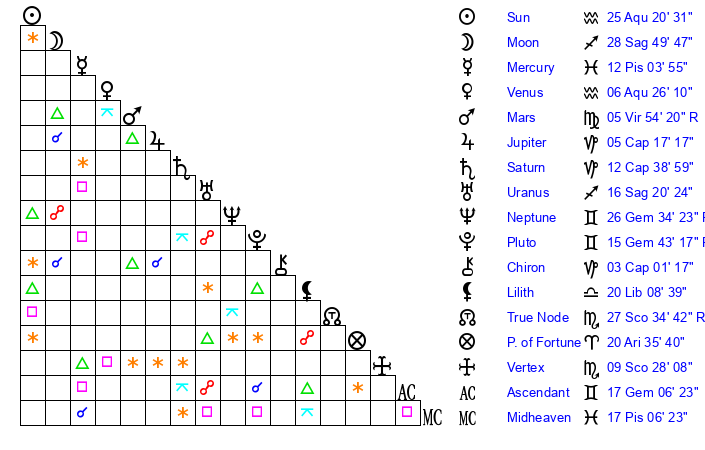 | Sun | 25 Aquarius 20 | 26 Aquarius 15 | 26 Gemini 43 |