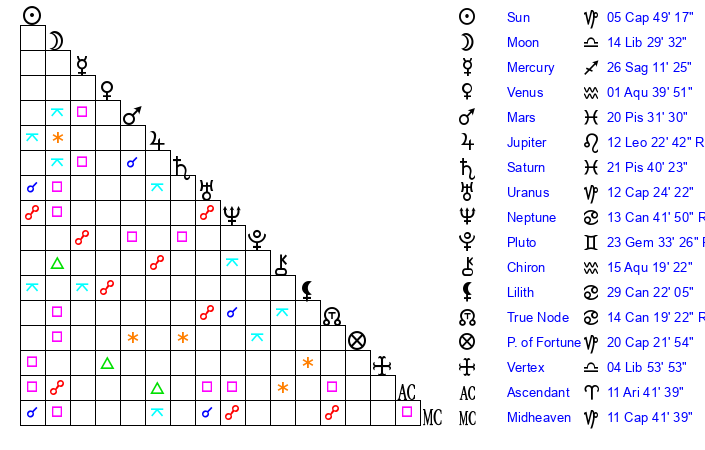 | Moon | 14 Libra 25 | 18 Aries 58 | 16 Aquarius 10 |