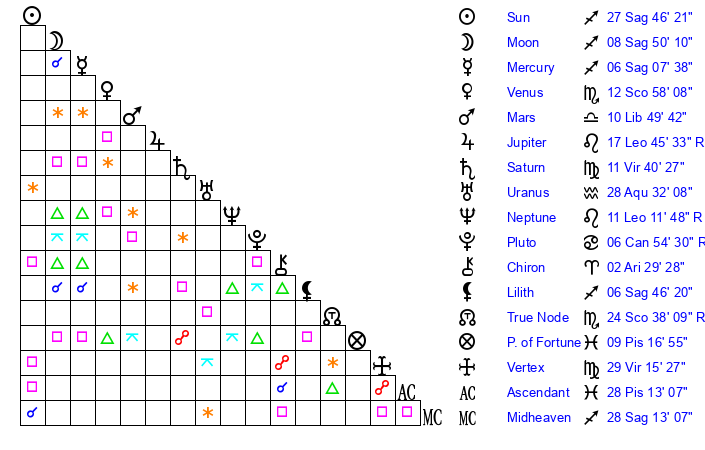 | Sun | 27 Sagittarius 46 | 29 Sagittarius 4 | 14 Aries 37 |