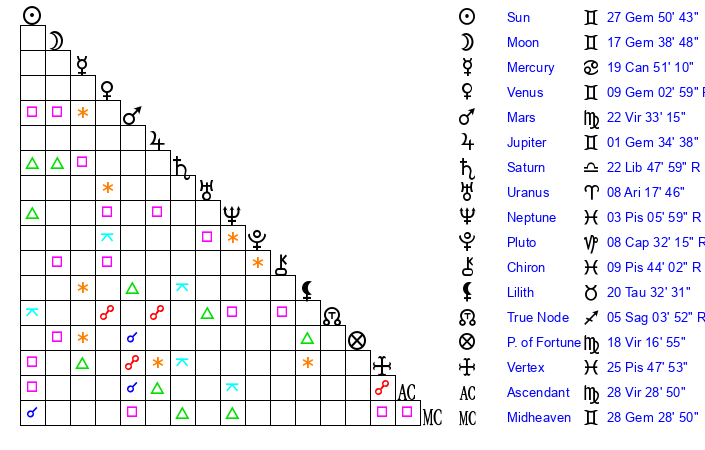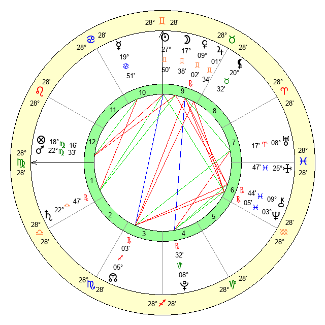 | Moon | 17 Gemini 42 | 26 Pisces 23 | 11 Sagittarius 40 |