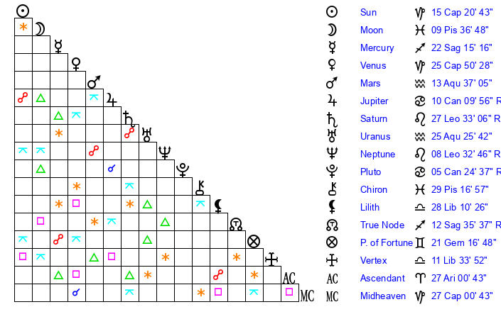 | Moon | 9 Pisces 34 | 12 Aries 52 | 22 Capricorn 18 |