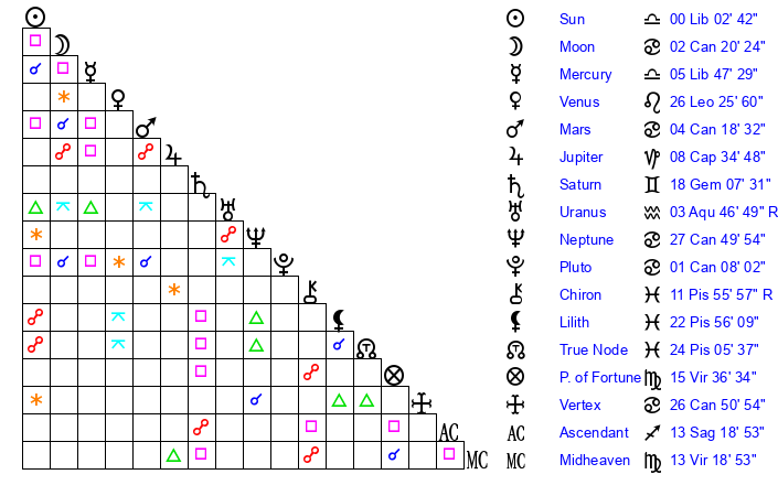 | Moon | 2 Cancer 13 | 21 Libra 57 | 12 Leo 9 |
