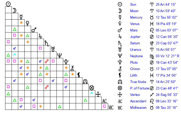 | Moon | 11 Aries 0 | 7 Sagittarius 6 | 22 Virgo 43 |