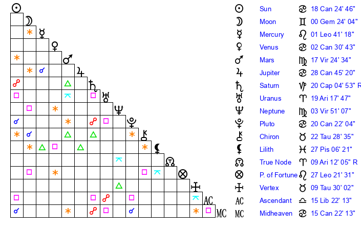 | Moon | 0 Gemini 17 | 29 Capricorn 53 | 19 Scorpio 40 |