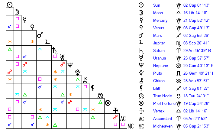 | Moon | 16 Libra 17 | 25 Aquarius 42 | 23 Sagittarius 39 |