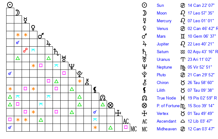 | Sun | 14 Cancer 22 | 14 Cancer 52 | 14 Libra 12 |