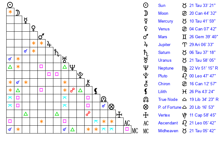 | Sun | 21 Taurus 33 | 21 Taurus 58 | 12 Leo 51 |