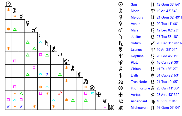 | Sun | 12 Gemini 36 | 13 Gemini 22 | 14 Virgo 34 |