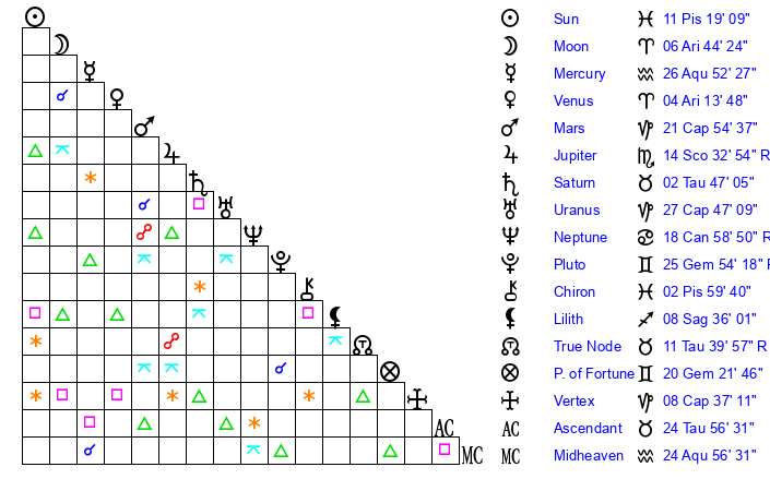 | Moon | 6 Aries 45 | 23 Aries 42 | 10 Gemini 31 |