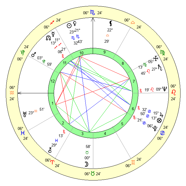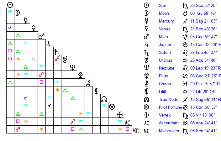 | Sun | 23 Scorpio 32 | 24 Scorpio 35 | 12 Pisces 4 |