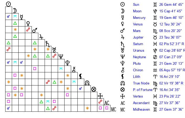 | Sun | 26 Gemini 45 | 27 Gemini 42 | 22 Libra 40 |