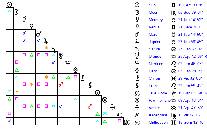 | Venus | 21 Gemini 30 | 26 Aries 35 | 2 Scorpio 34 |