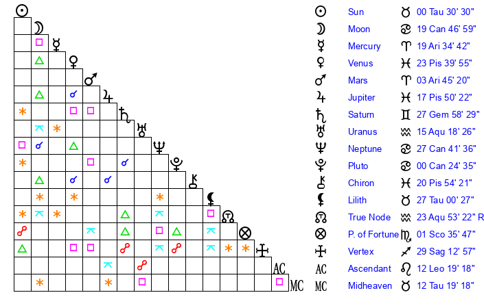 | Sun | 0 Taurus 30 | 1 Taurus 50 | 16 Leo 0 |