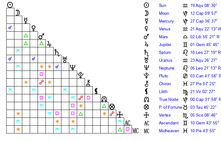 | Sun | 19 Aquarius 8 | 20 Aquarius 11 | 4 Gemini 36 |
