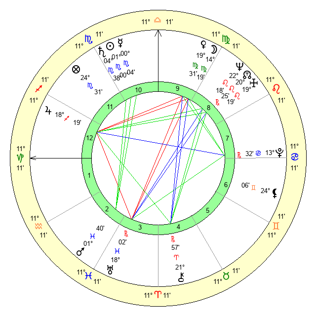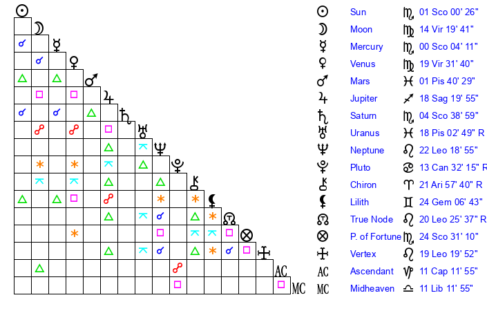 | Moon | 14 Virgo 19 | 6 Sagittarius 19 | 5 Gemini 44 |