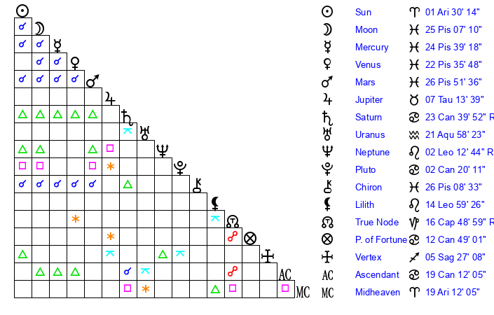 | Mars | 26 Pisces 52 | 20 Cancer 51 | 16 Gemini 45 |