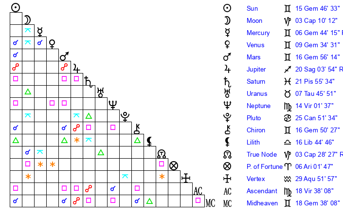 | Sun | 15 Gemini 46 | 16 Gemini 14 | 10 Virgo 59 |