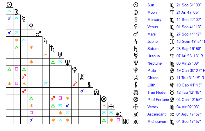 | Sun | 21 Scorpio 51 | 22 Scorpio 34 | 29 Aquarius 20 |