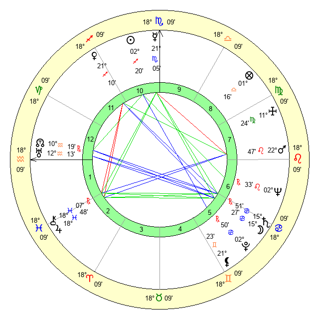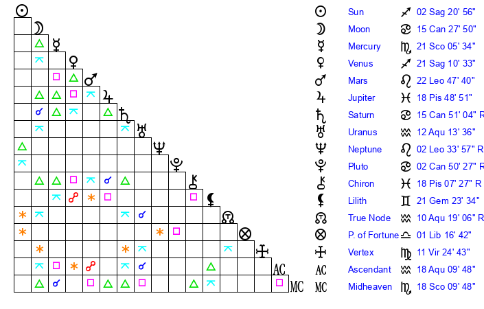 | Moon | 15 Cancer 30 | 3 Aquarius 30 | 25 Cancer 36 |