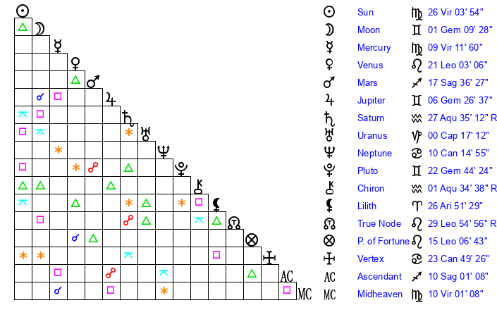 | Sun | 26 Virgo 4 | 27 Virgo 0 | 26 Capricorn 42 |