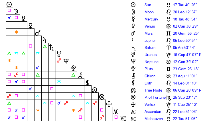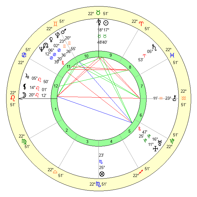 Jupiter | 5 Leo 38 | 22 Gemini 57 | 27 Leo 45 |