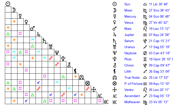 | Sun | 11 Libra 30 | 12 Libra 42 | 15 Aquarius 44 |