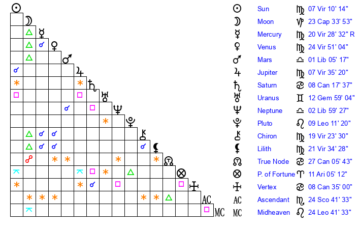 | Jupiter | 7 Virgo 27 | 17 Cancer 39 | 23 Virgo 9 |