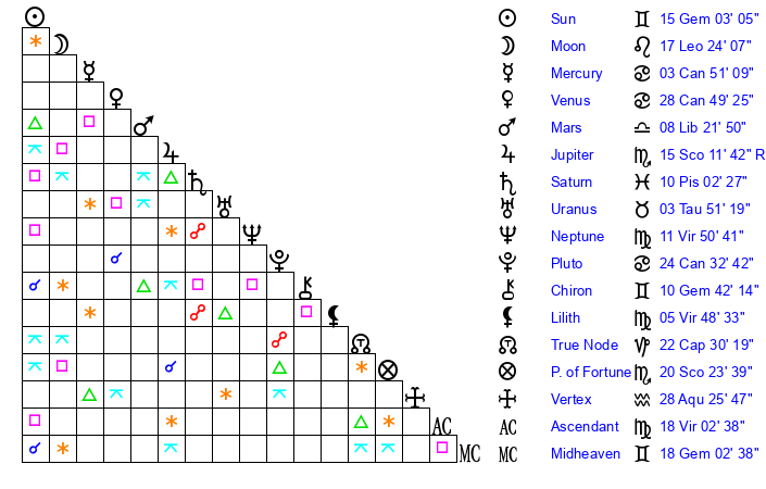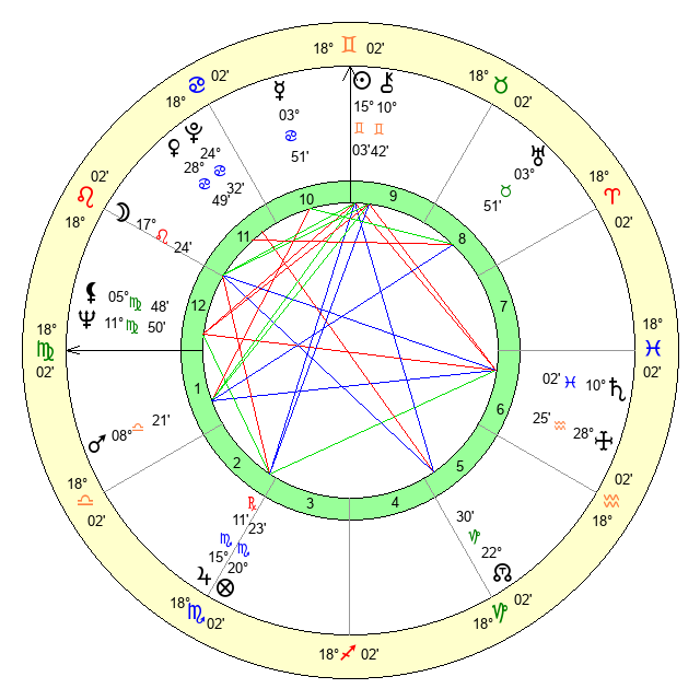 | Sun | 15 Gemini 3 | 16 Gemini 14 | 11 Virgo 13 |
