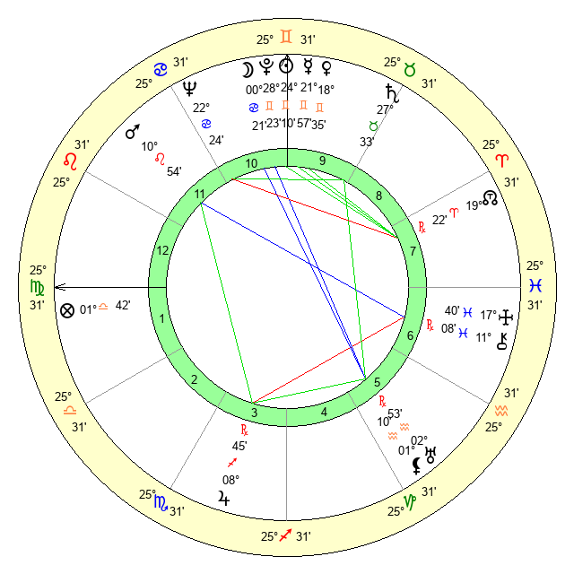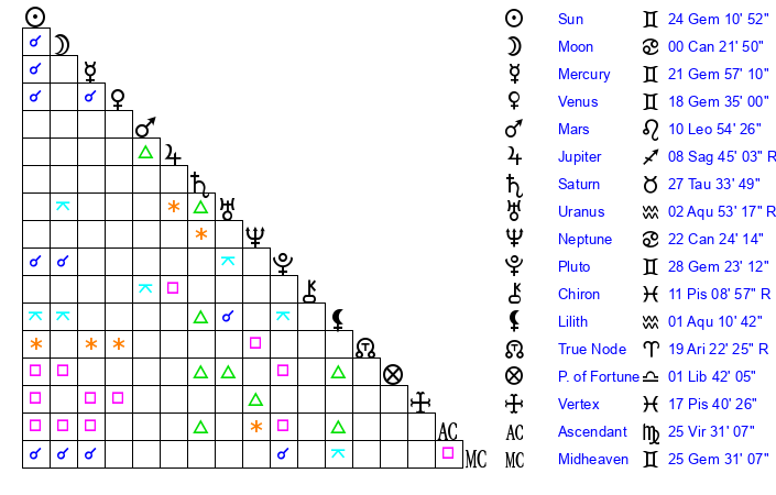 | Sun | 24 Gemini 11 | 24 Gemini 50 | 13 Libra 4 |