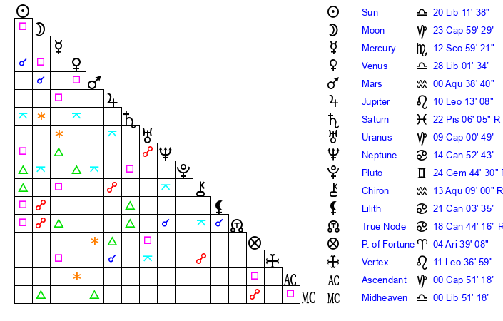 | Sun | 20 Libra 12 | 21 Libra 36 | 19 Aquarius 34 |