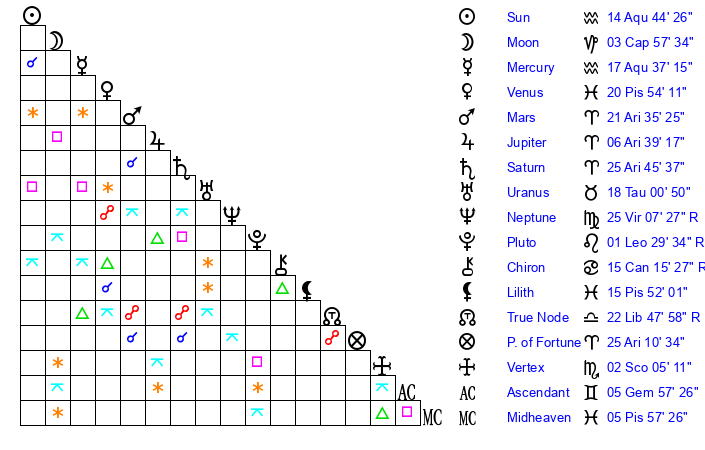 | Sun | 14 Aquarius 44 | 16 Aquarius 8 | 9 Taurus 12 |
