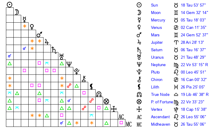 | Sun | 18 Taurus 54 | 19 Taurus 19 | 10 Leo 13 |
