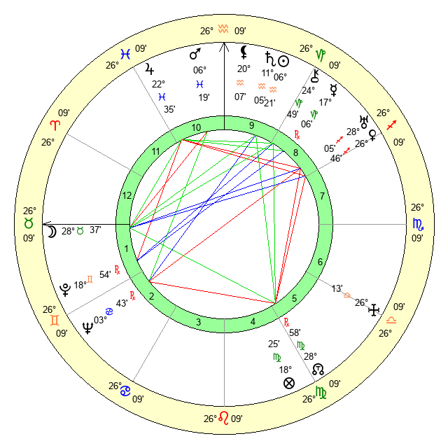 | Moon | 28 Taurus 39 | 14 Capricorn 55 | 14 Scorpio 54 |