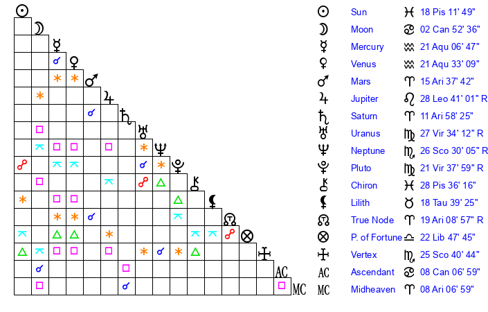 | Sun | 18 Pisces 12 | 18 Pisces 22 | 14 Taurus 16 |