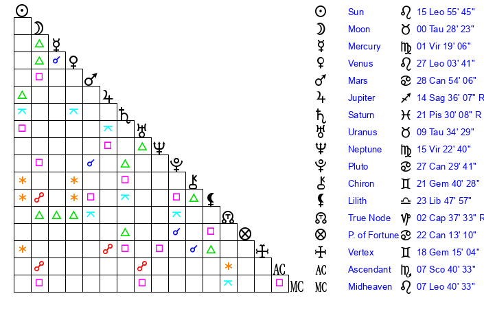 | Moon | 0 Taurus 21 | 8 Aquarius 41 | 8 Leo 54 |