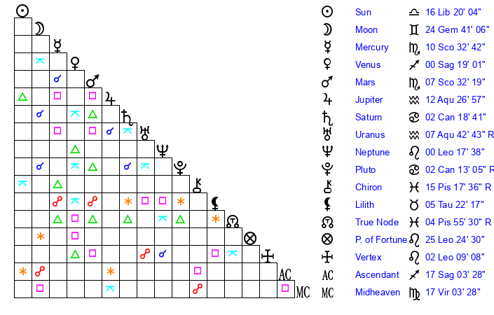 | Moon | 24 Gemini 39 | 3 Gemini 58 | 18 Cancer 15 |