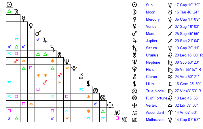 Moon | 16 Taurus 45 | 7 Taurus 38 | 24 Virgo 15 |