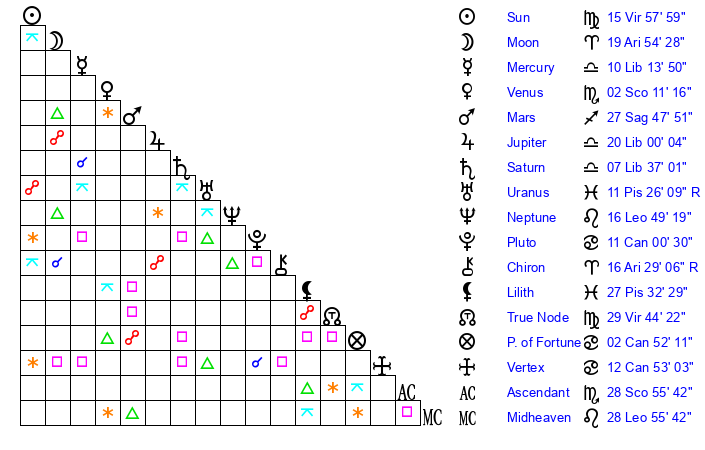 | Sun | 15 Virgo 58 | 17 Virgo 1 | 28 Sagittarius 48 |