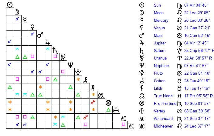| Sun | 7 Virgo 5 | 7 Virgo 34 | 9 Sagittarius 19 |