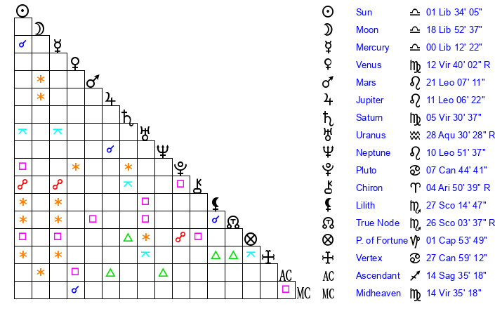 | Moon | 18 Libra 51 | 15 Scorpio 55 | 9 Virgo 15 |