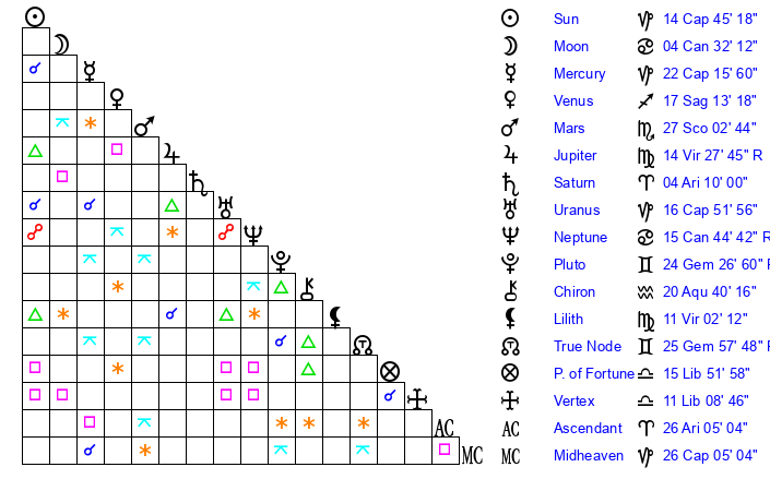 | Sun | 14 Capricorn 45 | 15 Capricorn 37 | 10 Taurus 40 |