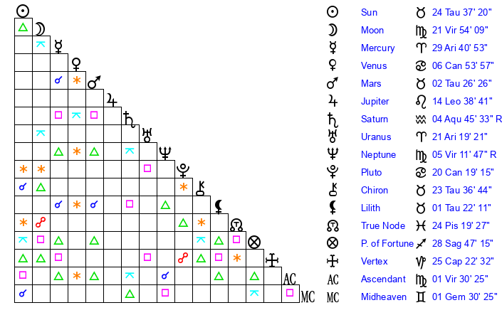| Neptune | 5 Virgo 11 | 1 Aries 30 | 7 Virgo 11 |