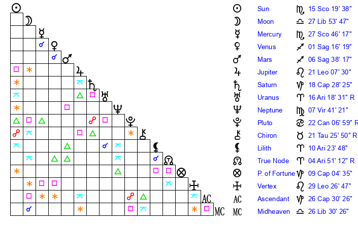 | Sun | 15 Scorpio 20 | 16 Scorpio 32 | 20 Aquarius 46 |