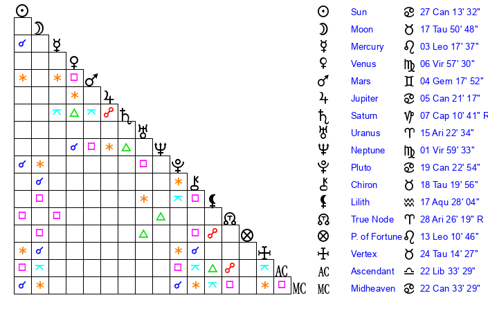 | Pluto | 19 Cancer 23 | 2 Aquarius 41 | 20 Cancer 53 |