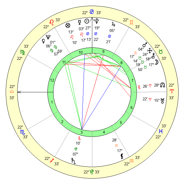 | Moon | 17 Taurus 42 | 3 Gemini 54 | 22 Scorpio 58 |