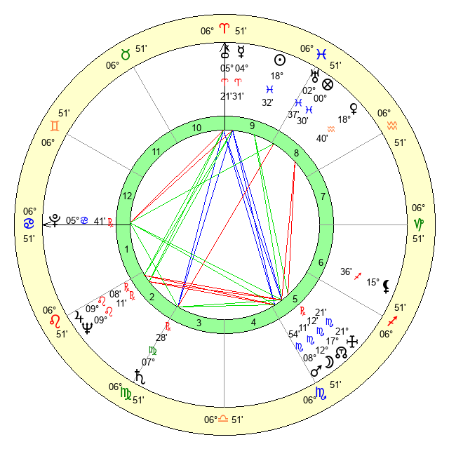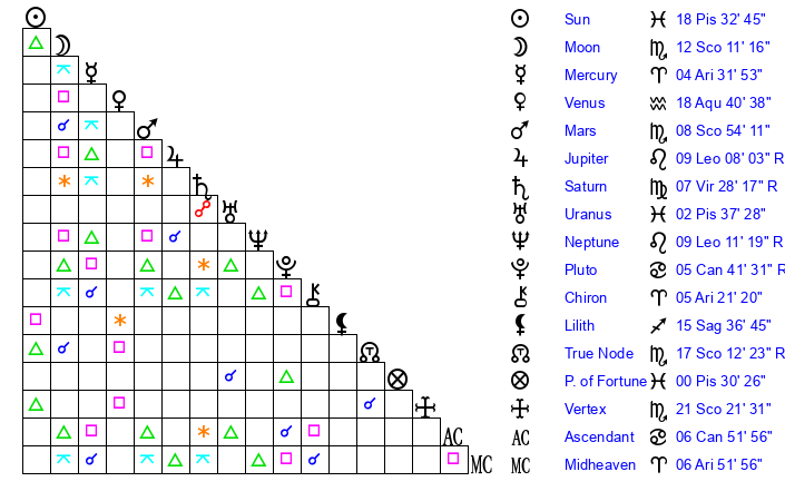 | Moon | 12 Scorpio 6 | 23 Cancer 0 | 20 Virgo 14 |
