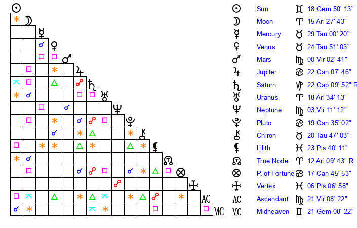 | Moon | 15 Aries 22 | 13 Sagittarius 11 | 26 Virgo 16 |
