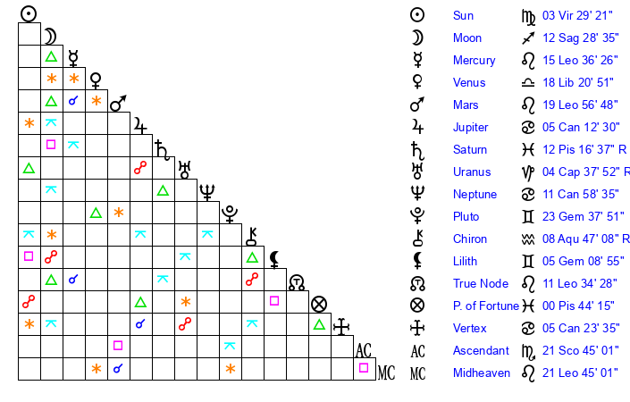 | Mercury | 15 Leo 36 | 19 Leo 21 | 11 Sagittarius 21 |