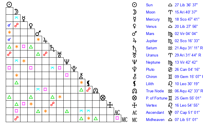 | Saturn | 21 Aquarius 41 | 26 Pisces 13 | 27 Aquarius 13 |